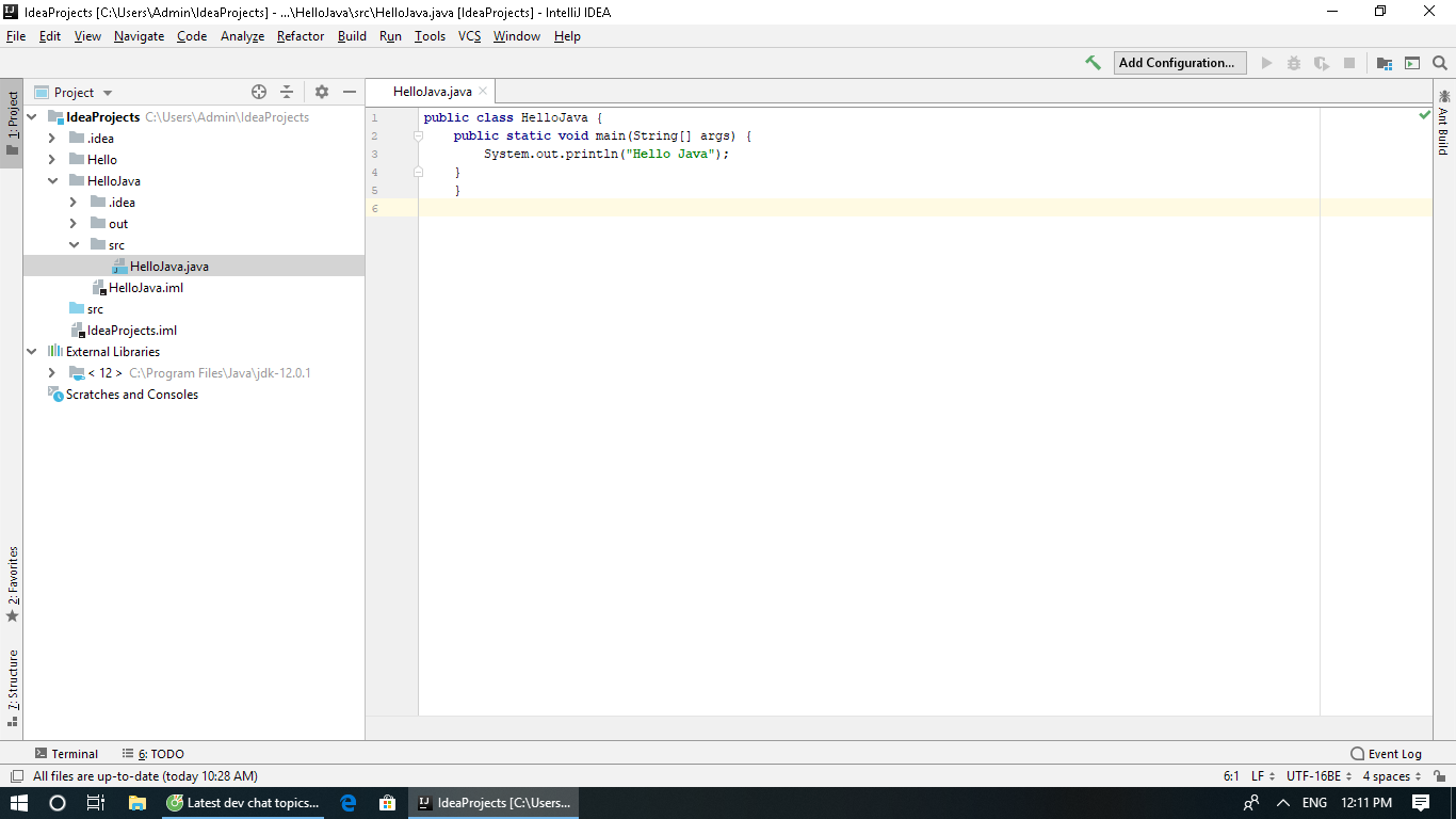 Đây là chương trình HelloJava e làm theo hướng dẫn từ những người dạy trên mạng. E không biết vì sao nút run nó ko hiện lên màu xanh, và cũng ko có hiện ở mỗi đầu dòng. E có thử chọn mục Run rồi chọn Run và nó hiện lên Debug, có edit configuration.