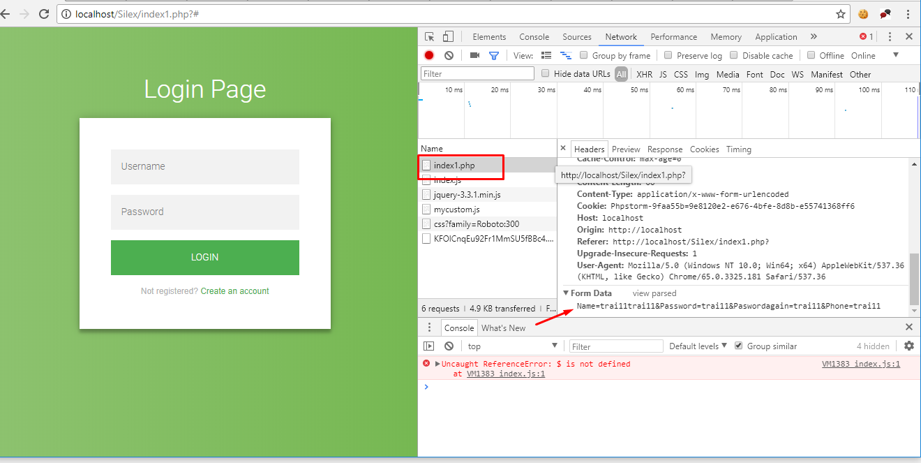 Khi mình nhấn submit nó k đến dc URL của API “/Silex/index.php/create-user” mà lại gửi về địa chỉ hiện tại dưới dạng form mà k phải JSON