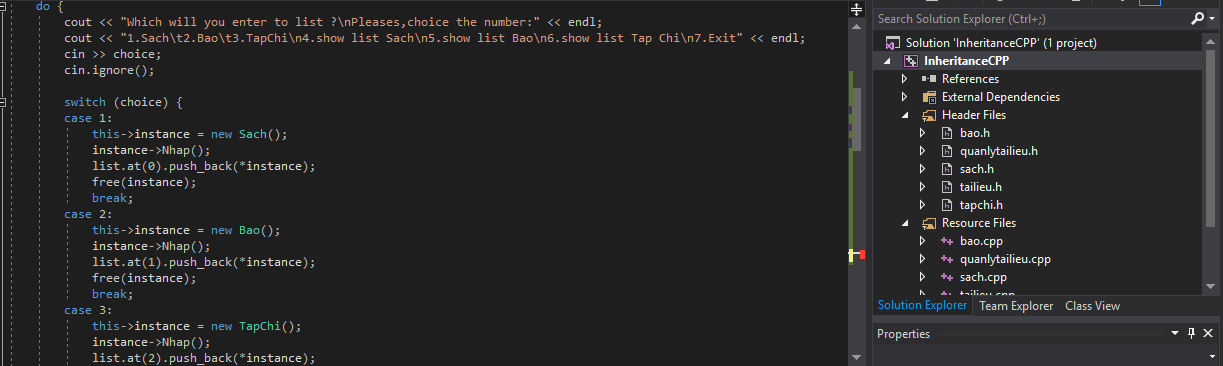 Mình dùng vector để lưu trữ 1 list các tài liệu (class tailieu là supper) gồm : sách, báo, tạp chí.