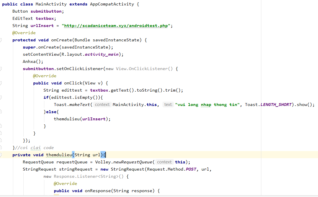 mình đã thử dùng thư viện volley nhưng mà bị một vài lỗi nhỏ khiến ứng dụng không chạy. mọi người có thể giúp mình được không ạ. cảm ơn nhiều ạ. nó bị lỗi new (replace with lambda) thì sửa như thế nào nhỉ