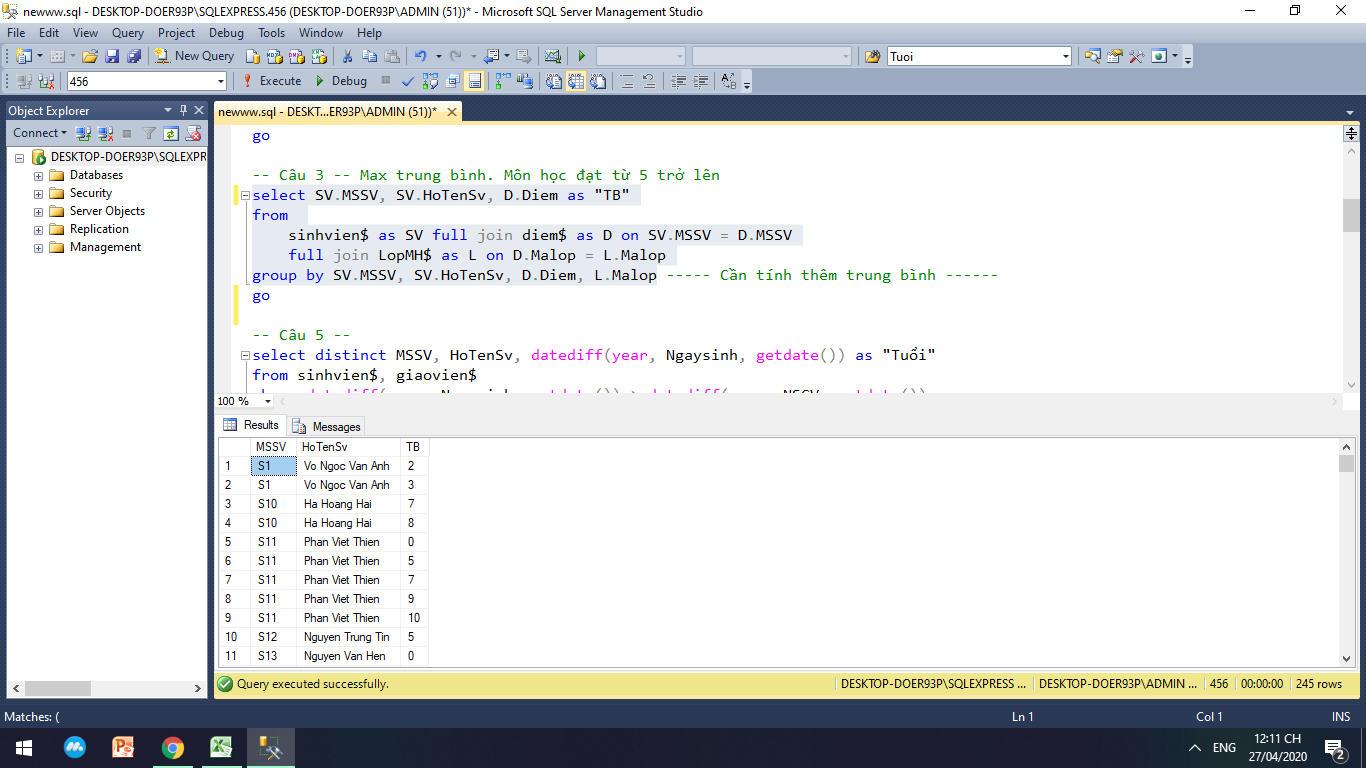 mình chạy cái này nó ra như thế này, nó liệt kê ra điểm của SV đó, điểm có bao nhiêu cột thì tên sinh viên lại duplicate bấy nhiêu cột, có cách nào để tính AVG k mọi người??