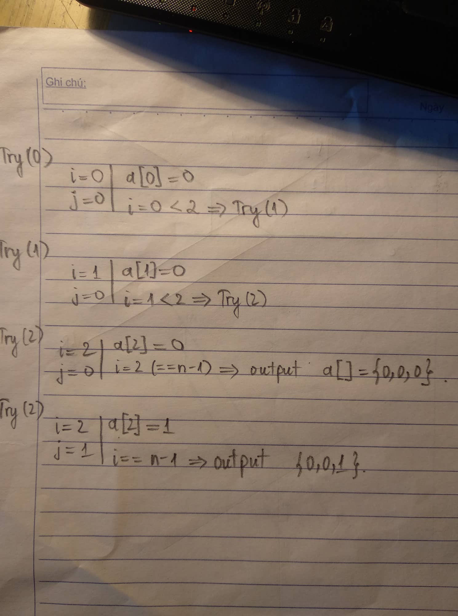 Bác nên vẽ cây nhị phân sẽ dễ diễn ta hơn là ghi step by step như thế. Bởi vì hàm try đó là hàm đệ quy.