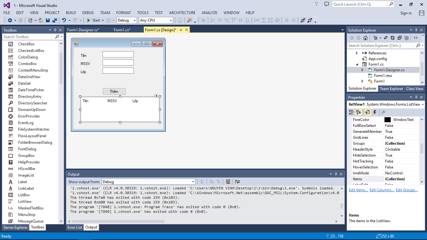Chào mọi người, mình có 1 listview với 3 items, bây giờ mình nhập thông tin xong mình bấm vào Thêm thì tự động nó add vào các cột tương ứng. Mình mò mãi mà không ra, mong các bạn giúp đỡ, mình cảm ơn.