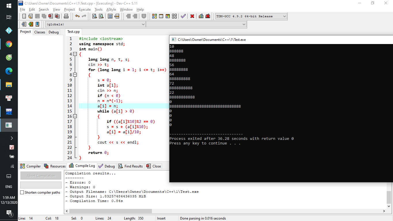 Nhập số bé thì k sao, chứ số lớn là kết quả bị sai, thậm chí nếu quá lớn nó ra 1 loạt số 0. Ban đầu em nghĩ là do tràn bộ nhớ nên sửa khai bao tất cả các biến từ “Int” thành “Long long” nhưng kết quả vẫn cứ là sai.