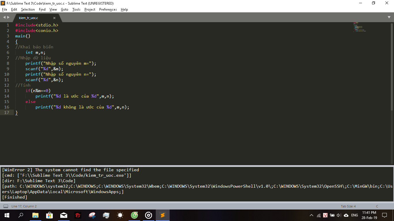 Nếu trong quá trình biên dịch gặp phải lỗi thì nó không tạo ra tập tin thực thi. Sẽ có báo lỗi: The system cannot find the file specified.