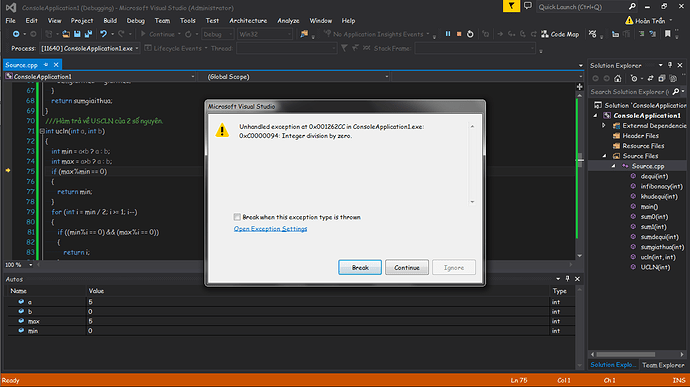 Hàm ucln của bạn phải kiểm tra điều kiện a hoặc b bằng 0 nữa. Sau khi gán max, min, thêm if (min == 0) return max;