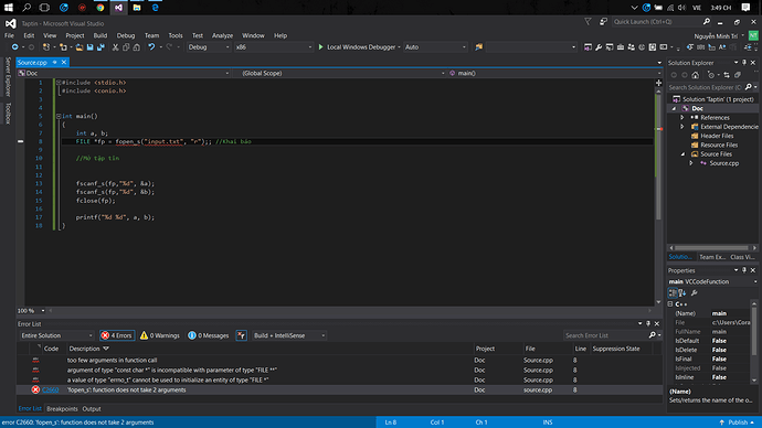 bạn chuyển thành fopen_s(&f,“input.txt”,“r”) hoặc
