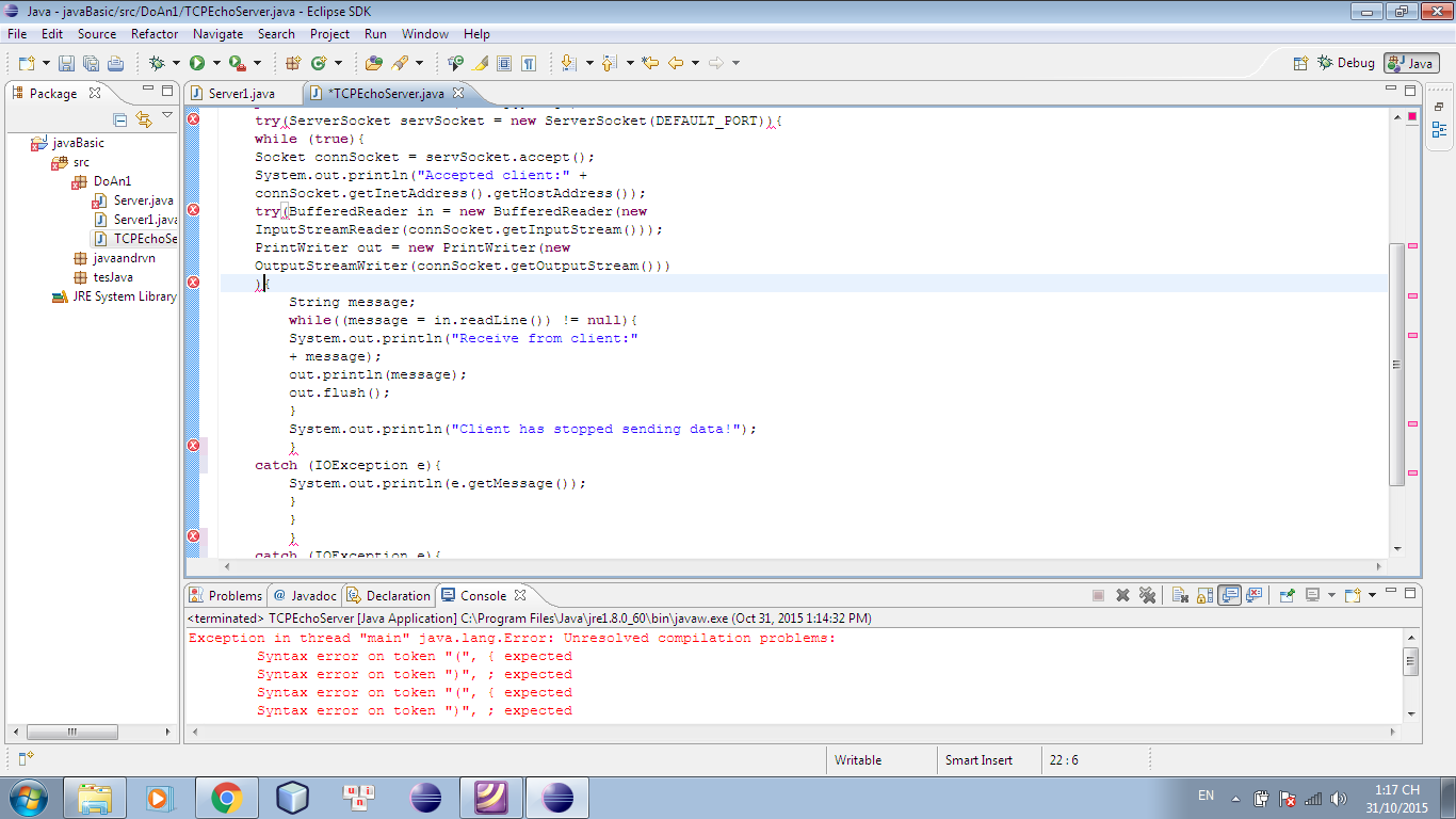 try(ServerSocket servSocket = new ServerSocket(DEFAULT_PORT)){ // try chứ không phải là try()