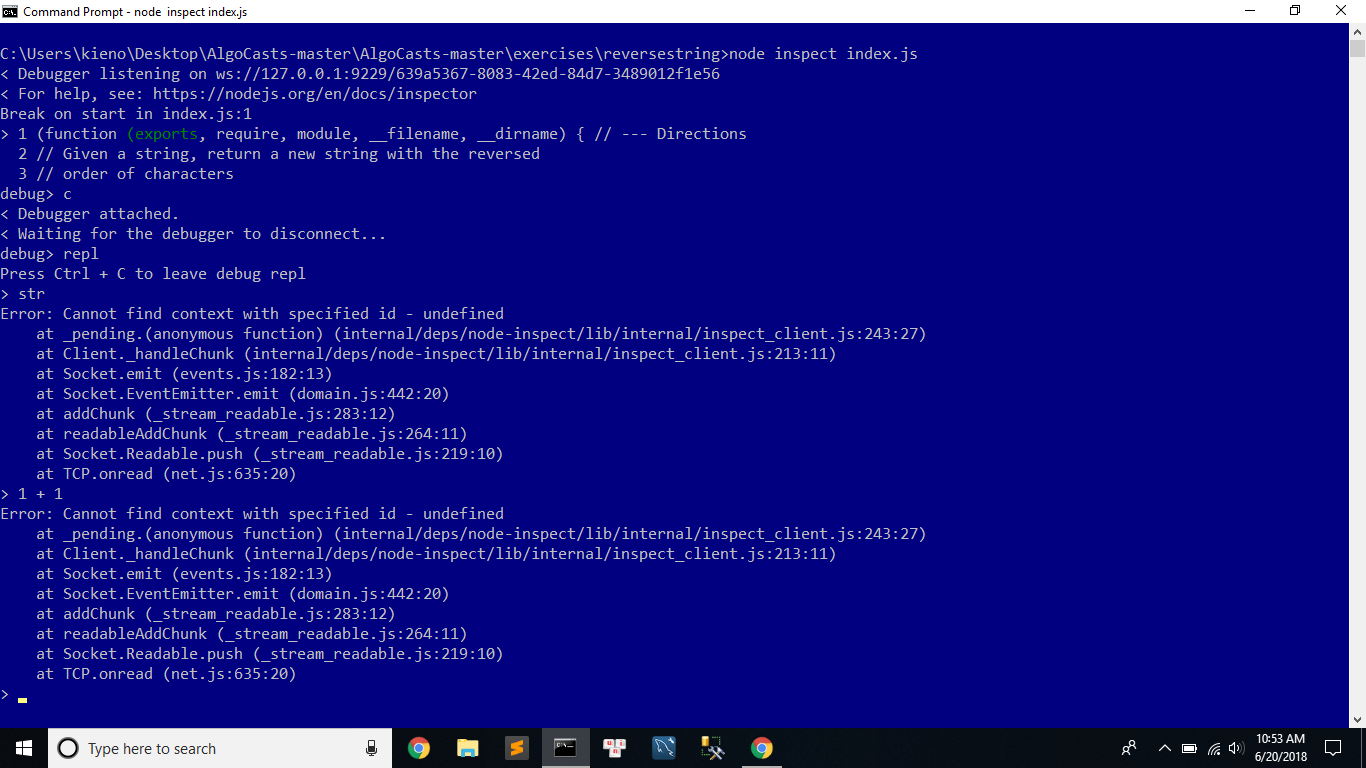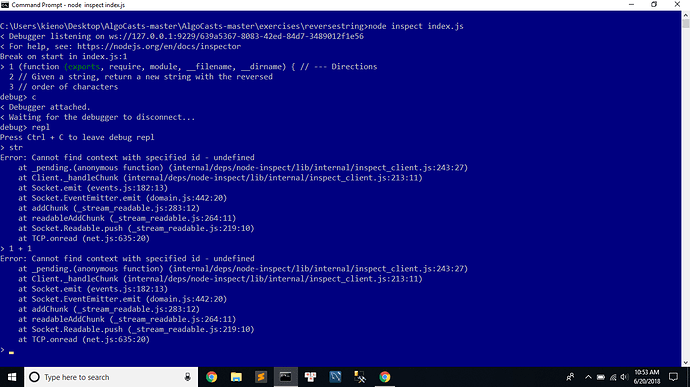 em đã sử dụng lệnh node inspect index.js để debug hàm reverse nhưng đến khi em nhập c (continue) thì bị lỗi như trong hình bên dưới. Em đã google nhưng vẫn không giải quyết được lỗi này mong các anh/chị giúp em với ạ ! Em cảm ơn anh chị