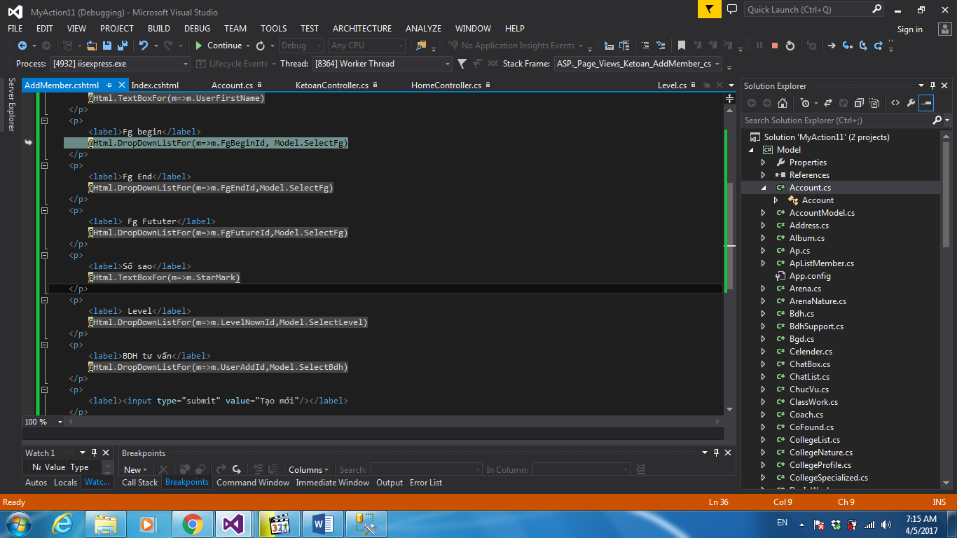Ở View sử dụng razo tạo DropDownListFor để lấy giá trị vào cho khoá phụ: