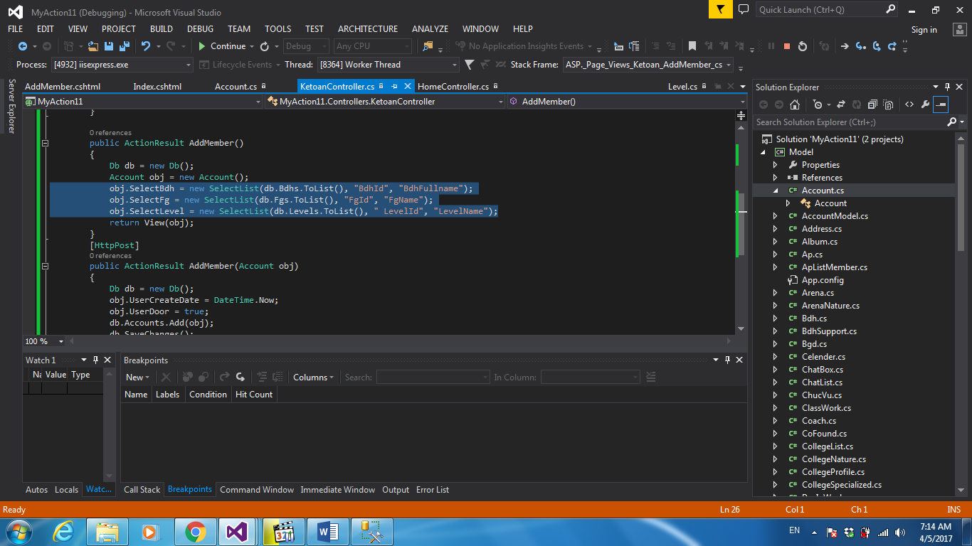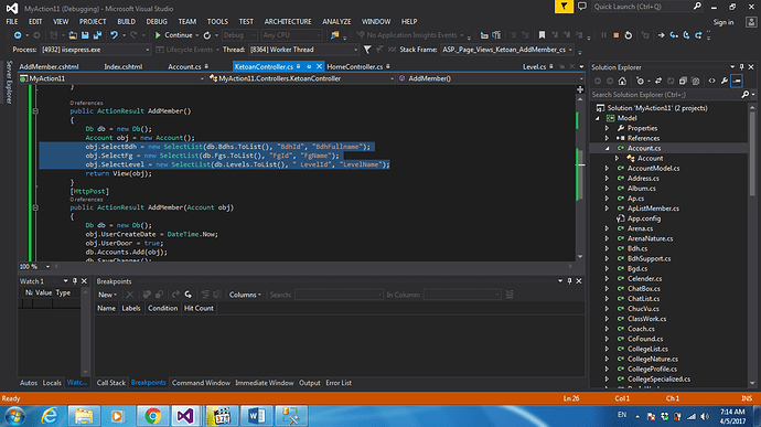 Bảng chính có các khoá phụ là Id của của bảng phụ, nên Minh dùng thuộc tính phụ khai báo thêm ở bảng thuộc tính bảng Select… để gán vào đó dữ liệu của bảng phụ dạng SelectList, nội dung hiển thị để chọn là Name, giá trị lẩy về là Id của Name tương ứng để truyền vào cho khoá phụ: