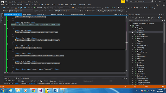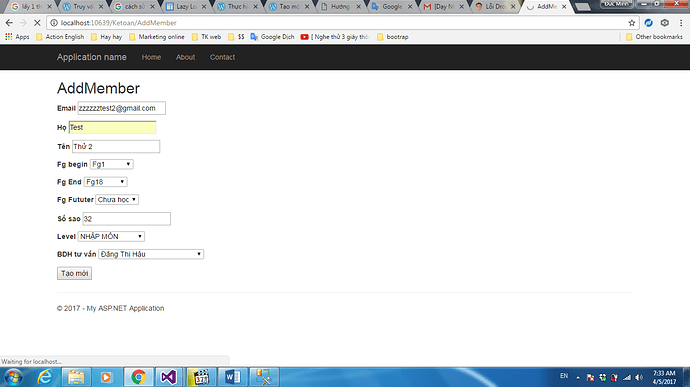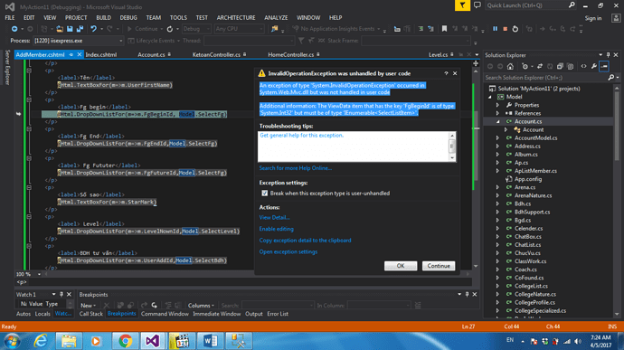 Ở View Page, khi nhập liệu xong chạy, dữ liệu được đẩy xuống database thành công, nhưng trang vẫn xoay vòng và báo lỗi khác kiểu dữ liệu : ví dụ báo kiểu dữ liệu của database được gán là Int32, kiểu dữ liệu truyền vào là 'IEnumerable ’