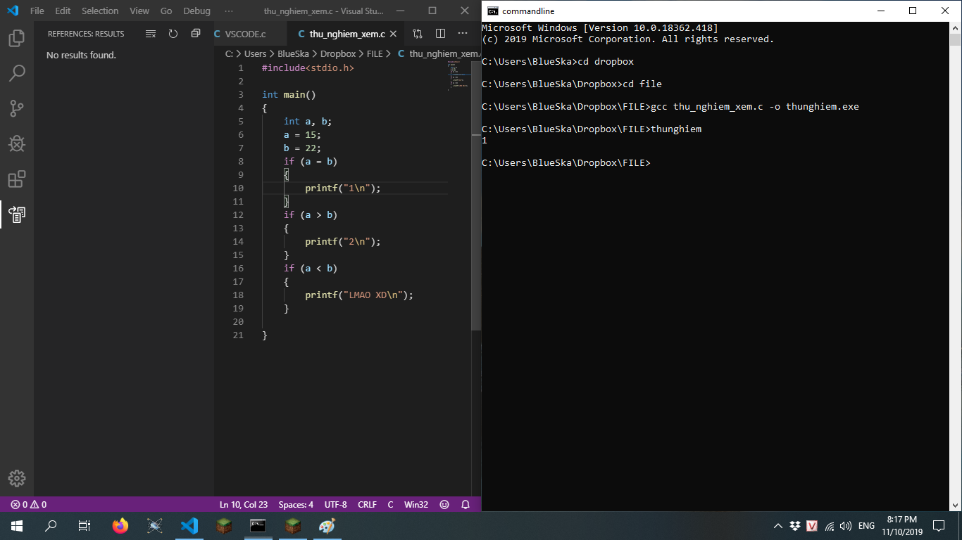 Cho mình hỏi, tại sao khi mình làm a = 15, b = 22 mà nó cứ cho ra dòng chữ phải ra nếu a = b vậy mấy anh, em dùng vscode để lập trình C ạ