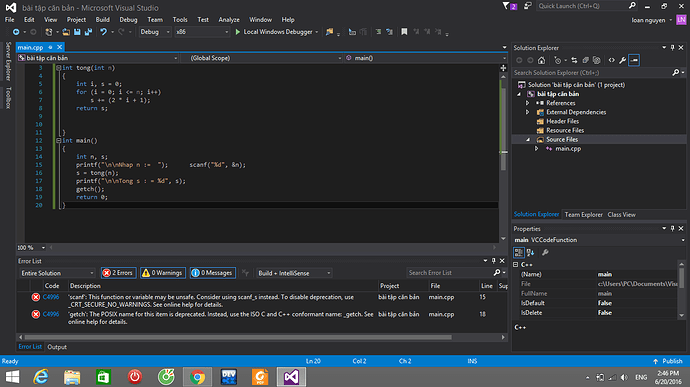 Anh có thể làm theo cách của anh @tucanhminh, hoặc sửa getch thành_getch, scanf thành scanf_s nha. Còn tại sao thì anh có thể xem ở đây: Compiler Warning C4996 Và C Run-time Library Hay _CRT_SECURE_NO_WARNINGS (CRT)