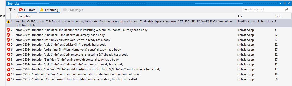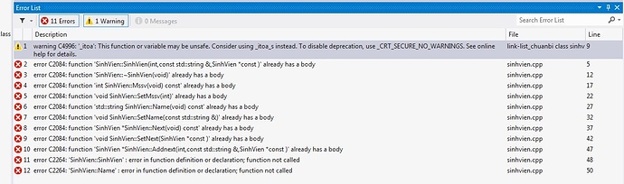 Mình viết lại chương trình khá là đầy đủ nội ( các file *.h, *.cpp) . Tuy nhiên khi chạy nó có báo lỗi như hình đính kèm.