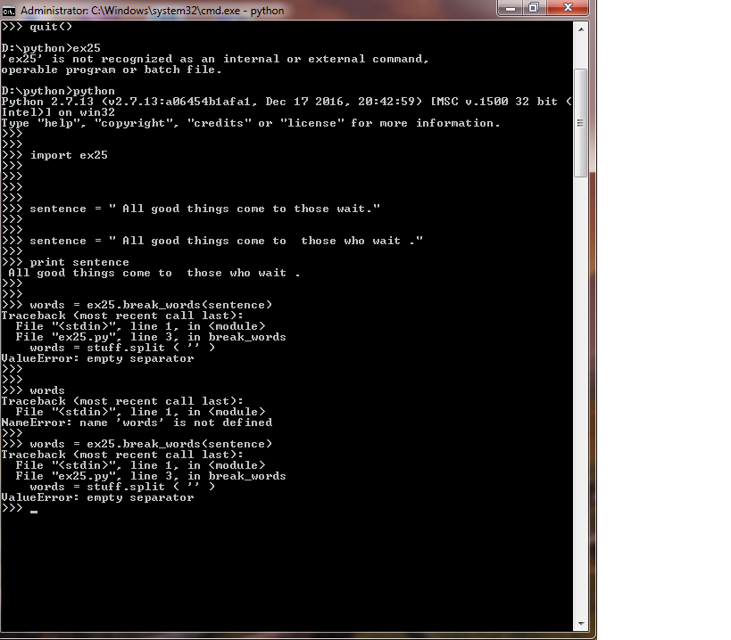 Phần bên trong ngoặc của split phải là 1 xâu khác rỗng. Error nói rất rõ. Bạn học lại cú pháp cơ bản.