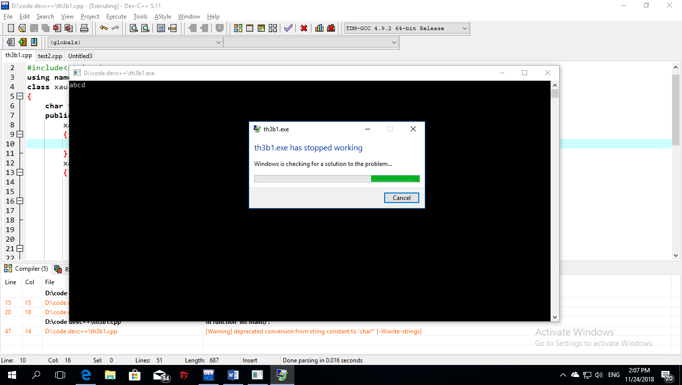 Anh chị giúp em câu này với. Em cho chạy code thì nó chỉ hiển thị xâu abcd chứ nó không hiện xâu sau khi em gọi đến hàm doichuhoa(). A/c xẹm hộ em lỗi ở đâu vs ạ. Em cảm ơn.