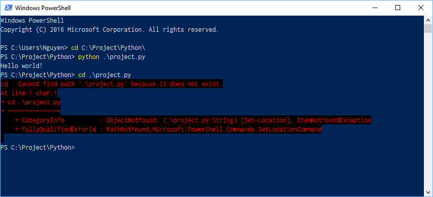Giả sử ta đang từ thư mục “C:\Users\Admin” nhưng muốn chuyển sang “C:\Project\Python” để chạy file ‘project.py’ thì sơ sơ như sau: