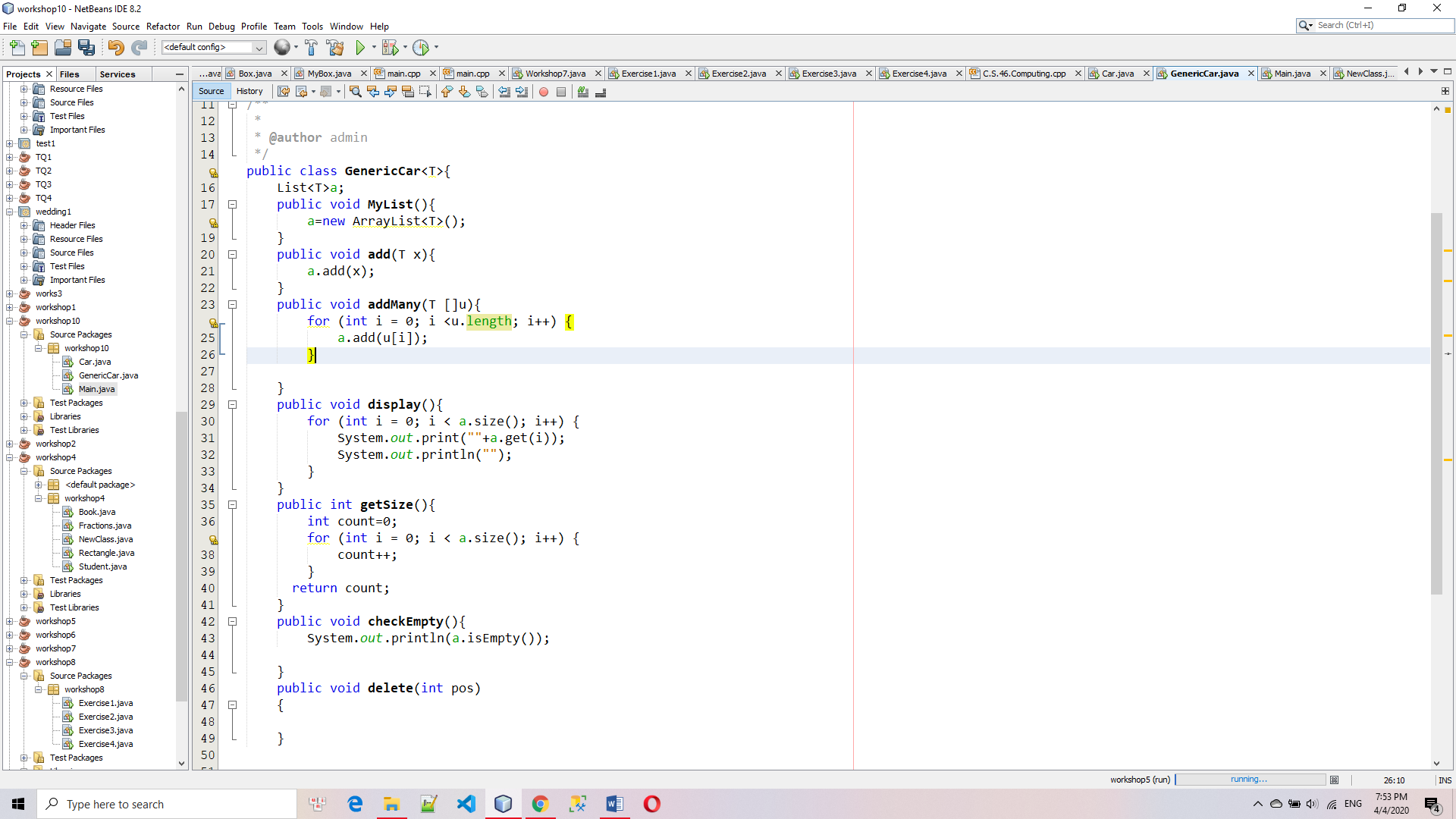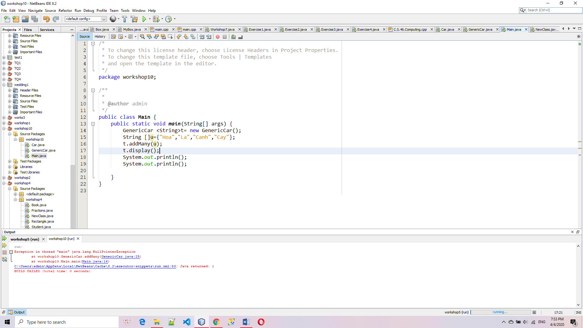 Trong trường hợp của bạn, thuộc tính a của class GenericCar<T> chưa được gán giá trị nào nên sẽ ko thể thực hiện lời gọi hàm a.add(u[i]) (trong hàm addMany()).