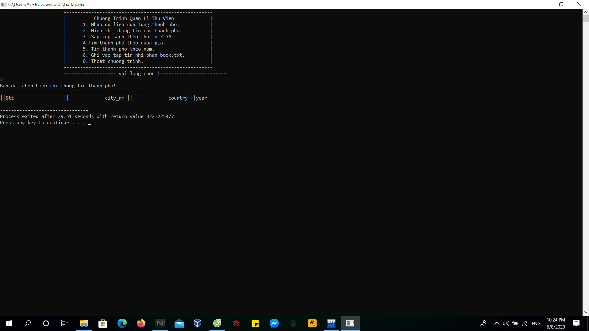 printf("Ban phai nhap thong tin thanh pho truoc!\n");
