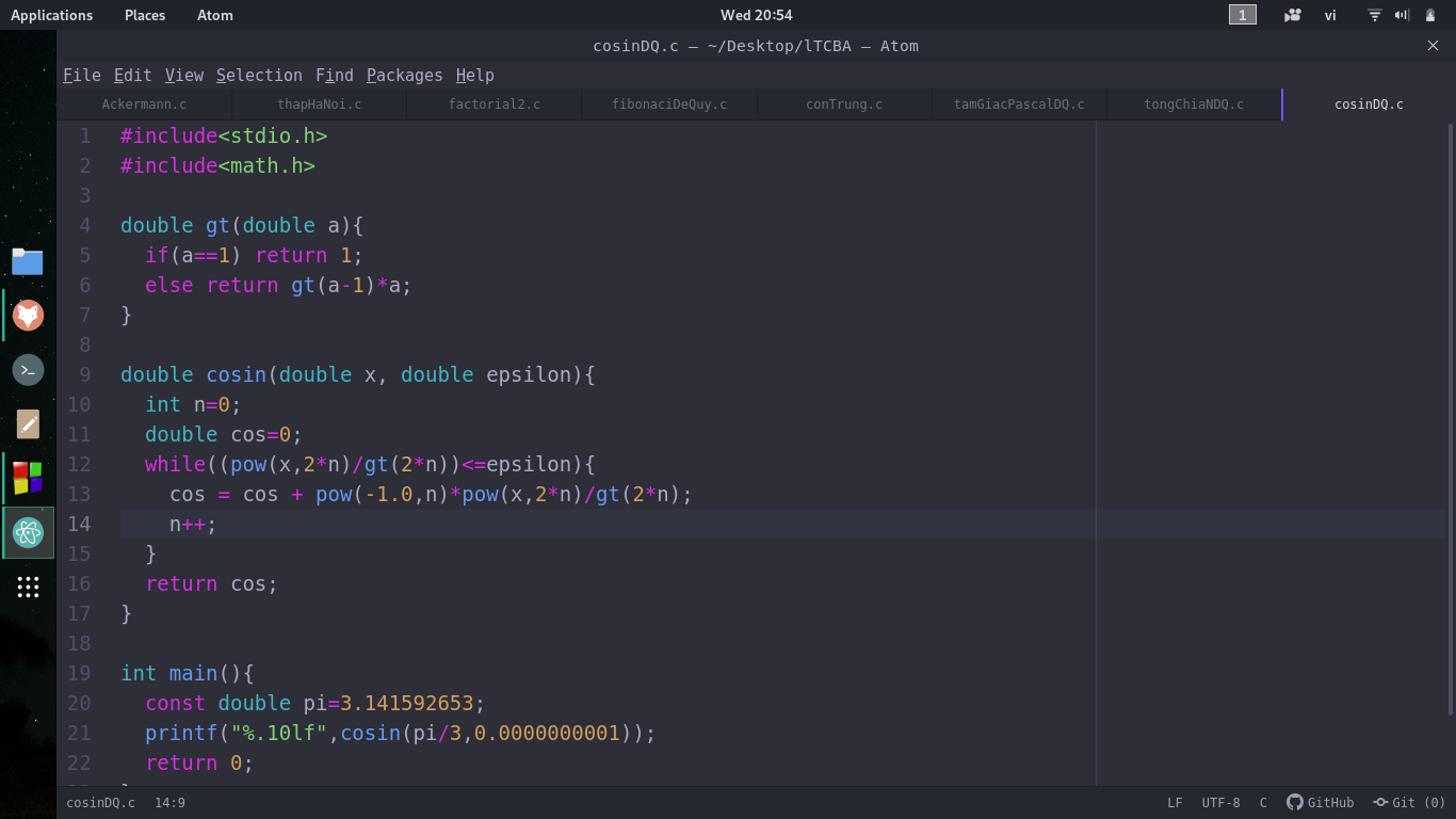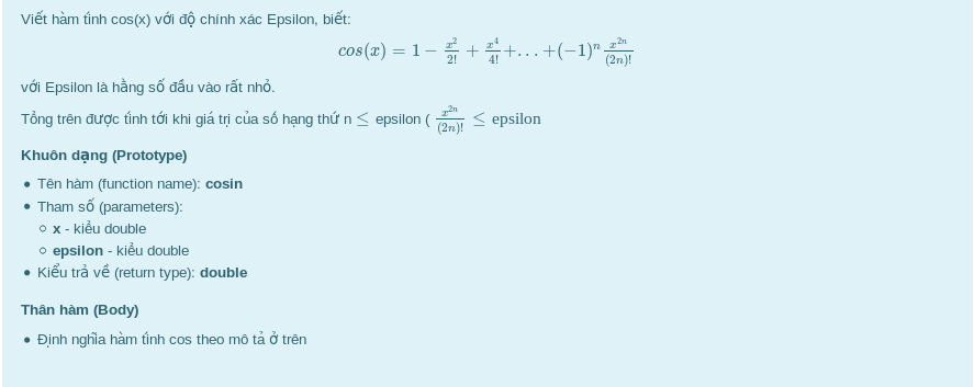 Chào mọi người, em đang viết chương trình tính hàm cos với độ chính xác Epsilon nhưng khi chạy thì bị báo lỗi segmentation fault, không hiểu bị lỗi chỗ nào mong mọi người giúp đỡ!