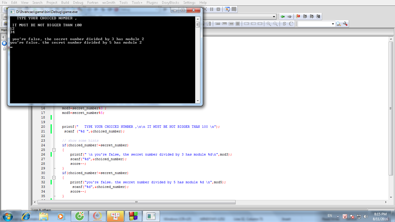 Mọi người xem lỗi giúp em với ạ , em đang nghịch , định làm 1 trò chơi đơn giản có luật là : " phần mềm tạo ra 1 số random<100 , người chơi đoán số đó dựa vào số dư của số đó khi chia cho các số nguyên tố ,cứ sai 1 lần là có thêm 1 gợi ý " . Em đã code như sạu: