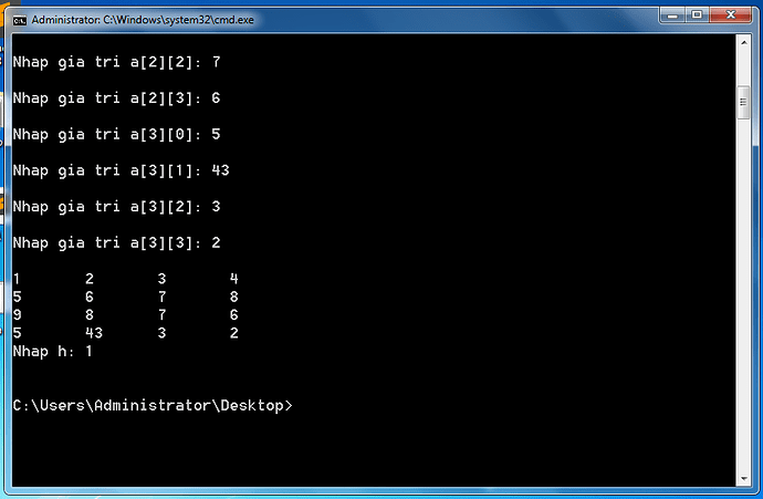 Bài tập xóa đi 1 dòng h trong mảng 2 chiều a thì em làm như dưới ạ, nhưng đến khi compile và chạy thì khi in ra mảng sau khi xóa thì không được ạ, trong khi những bài tập khác thì in ra bình thường