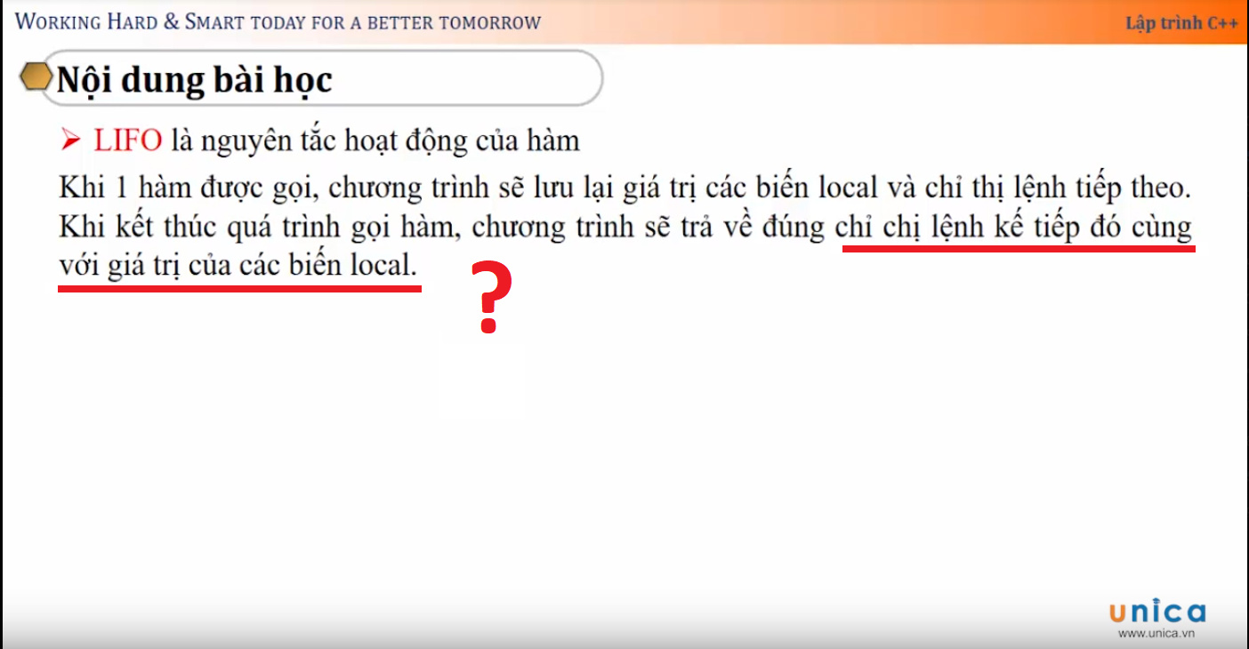 Nhưng sau khi thực hiện xong hàm được gọi (gặp lệnh return) thì chương trình cần quay về thực hiện lệnh nằm phía dưới lệnh gọi hàm. Thế thì nó cần nạp lại giá trị cho thanh ghi PC địa chỉ của lệnh tiếp theo chính là địa chỉ lệnh phía sau lệnh gọi hàm (đoạn màu đỏ). Ở chu kỳ tiếp theo, CPU quay về thực hiện tiếp các câu lệnh sau lệnh gọi hàm.