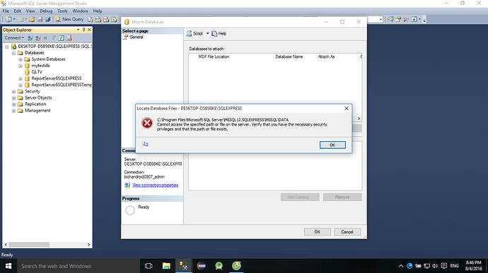 .Còn khi dùng tài khoản của Windows Authentication thì lại xem được, và em thử dùng tài khoản windows để attach 1 file .mql trong C:\Program Files\Microsoft SQL Server\MSSQL12.SQLEXPRESS\MSSQL\DATA thì nó lại báo lỗi thế này ạ