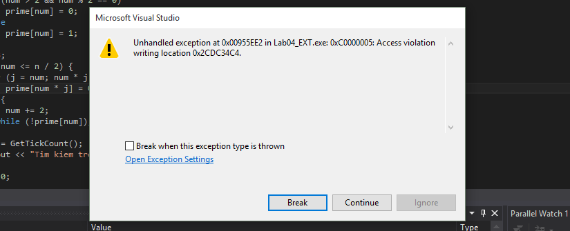 Trong khi chạy int hay long thì bị báo lỗi vùng nhớ như hình.