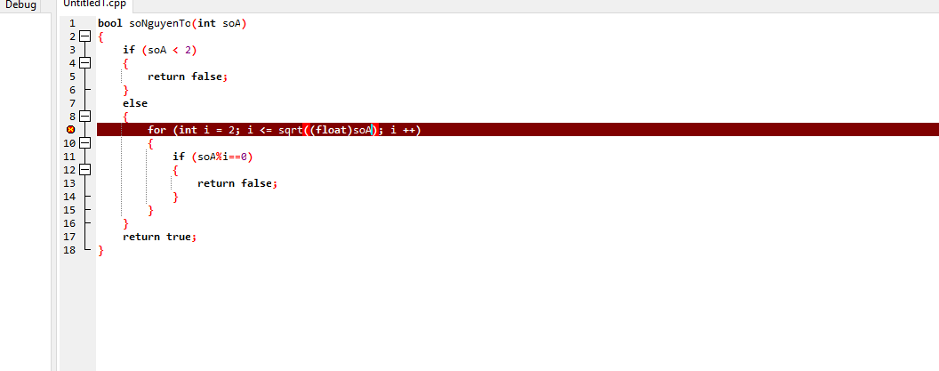 for (int i = 2; i <= sqrt((float)soA); i ++) // <- error
