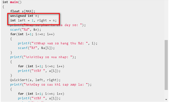 void QuickSort(float a[MAX], int left, int right)