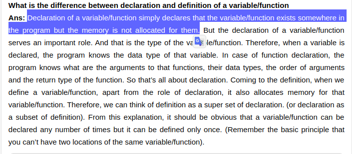 Declaration của một biến/hàm cho biết biến/hàm đó tồn tại ở đâu đó trong chương trình nhưng nó không được cấp phát bộ nhớ bởi lệnh khai báo đó.