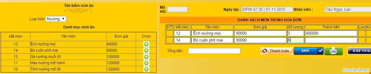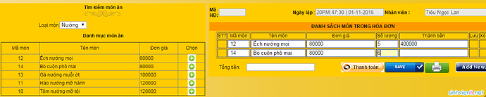 Mọi người ơi, em muốn tạo form hoá đơn bằng php như hình như hk bik dùng cách gì để khi chọn món thì sẽ hiển thị qua bên bảng hoá đơn và tính tiền. ,Mong mọi người giúp
