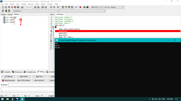 Chào mọi người, mình có thắc mặc là tại sao khi mình có 3 biến chuỗi có độ rộng 5 char và được nhập như hình, mình thắc mắc tại sao khi mình nhập vào 4 char mà khi debug không thấy kí tự kết thúc chuối \0 xuất hiện, ý mình không phải là muốn xuất ra console kí tự NULL mà là nội dung của biên hiện thị trong phần debug kìa ? nếu đúng theo lý thuyết thì ký tự cuối cùng là kí tự kết thúc chuỗi vậy a[4] phải là \0 và phải nằm trong chuỗi chứ ?