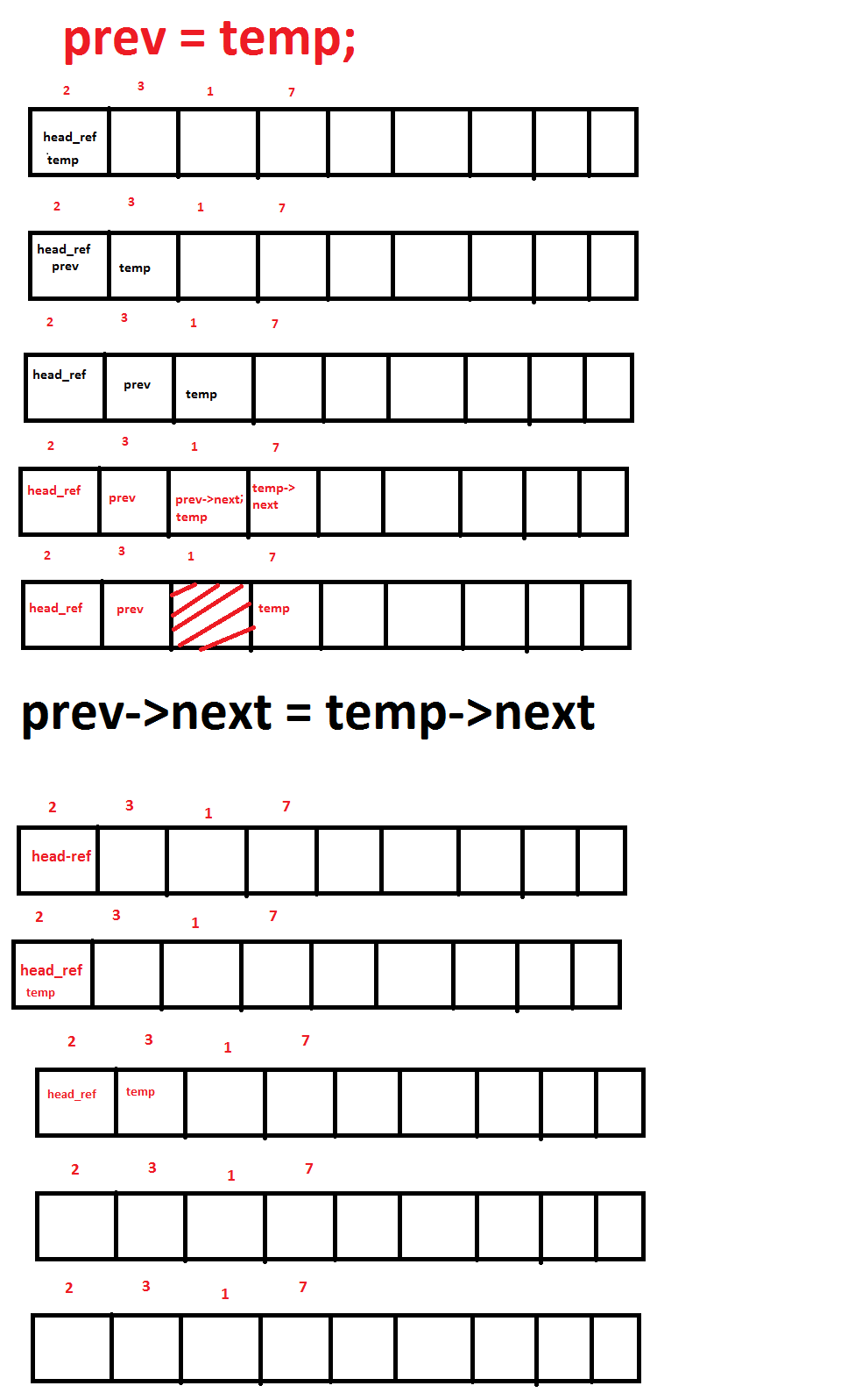 Khi temp = temp->next vaf prev = temp thì con trỏ prev sẽ trỏ đến địa chỉ của temp->next và head_ref không thay đổi. Nhưng khi prev->next = temp->next thì head_ref lại được thay đổi.