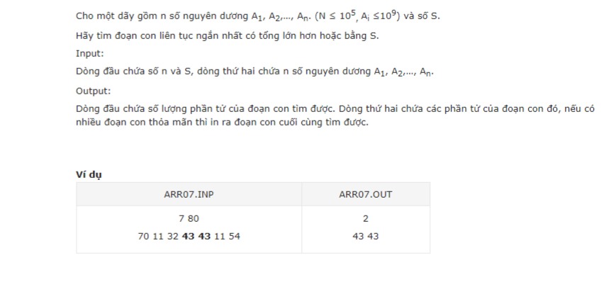 Cho một dãy gồm n số nguyên dương A1, A2,…, An. (N ≤ 10^5, Ai ≤10^9) và số S. Hãy tìm đoạn con liên tục ngắn nhất có tổng lớn hơn hoặc bằng S.