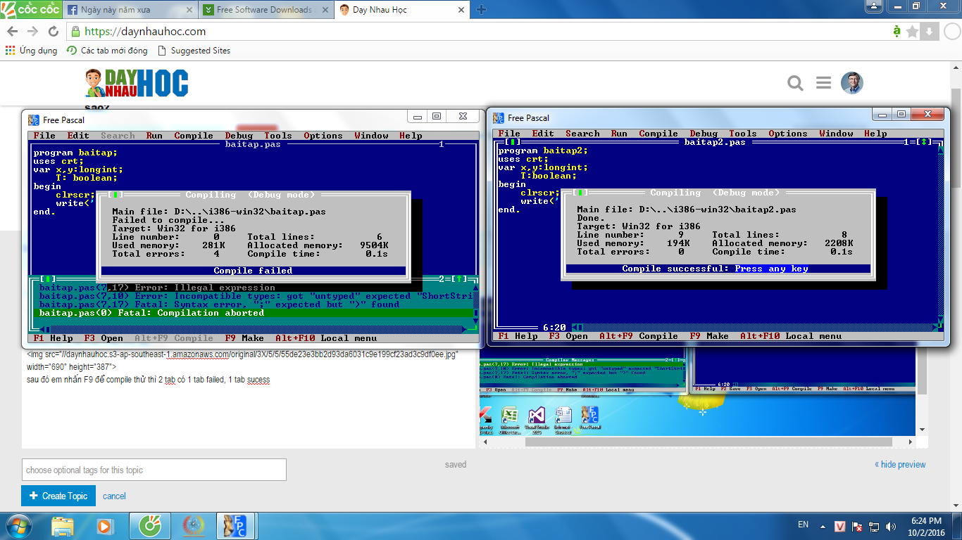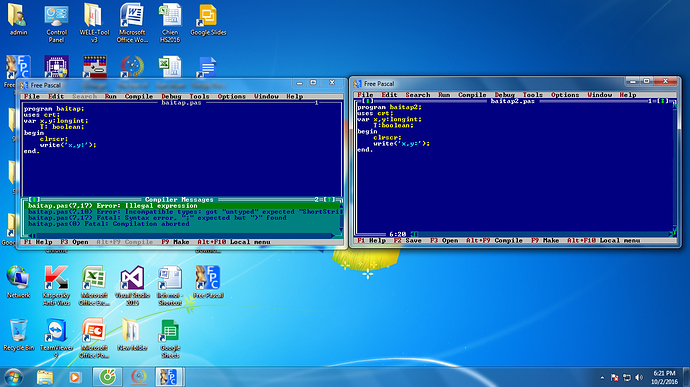 Hôm nay em được thằng bạn hỏi về lỗi trên pascal, em thử viết ra thì không hiểu sai ở đâu , sau đó em thử test vài đoạn code trên pascal trên 2 tab khác nhau như sau :
