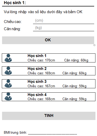 Có 2 cái editText edtChieuCao và edtCanNang để cho người dùng nhập liệu. Sau khi người dùng nhập xong thì bấm nút btnOK, dữ liệu đổ ra bên dưới. Sau đó, người dùng bấm vào btnTinh thì sẽ cho kết quả trung bình.