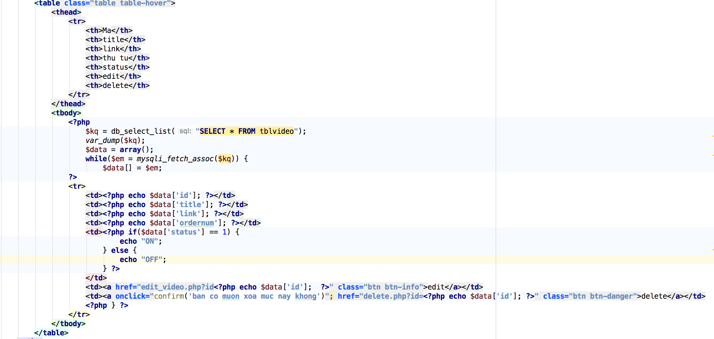 hàm db_select_list($sql) trả về một mảng thuần tuý nên bạn chỉ cần dùng vòng lặp in ra thôi (foreach cho dễ). foreach ($kq as $row).