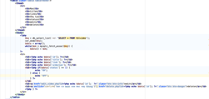 e viết function db_select_list() trong một file thư viên, và gọi function đó trong (pic1) để hiển thị nội dung từ database. dùng " var_dump " in kết quả thì ra được dữ liệu. nhưng dùng vòng lặp while thì k . mn cho e hỏi sai ở chỗ nào ạ.