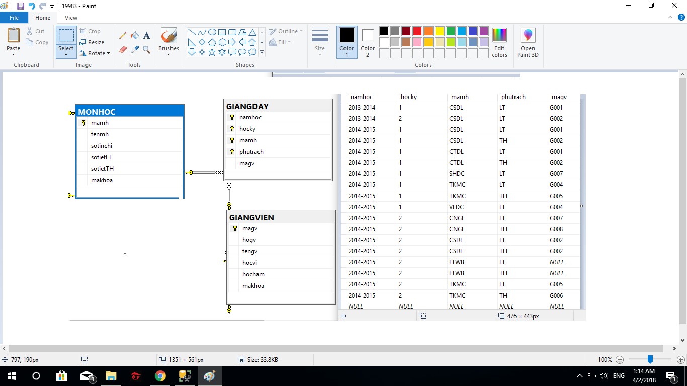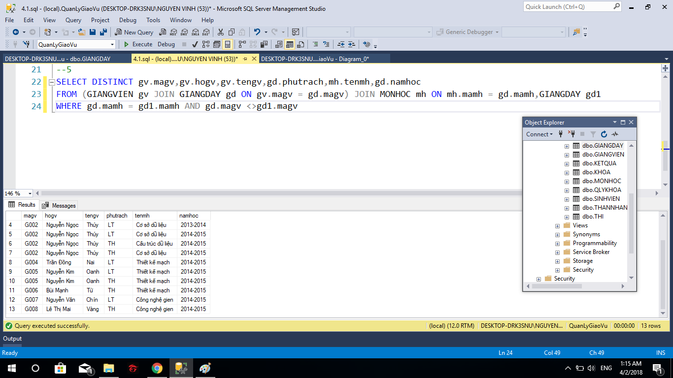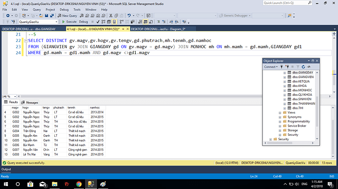Chào mọi người, mình là sv năm 2, mình gặp chút khó khăn khi truy vấn sql với nhiều bảng, đề yêu cầu “Tạo danh sách mã số và tên những giảng viên dạy LT và TH cùng một môn học”, mình có làm mà sai, mong mọi người chỉ ra lỗi sai của minh, cảm ơn mọi người đã giúp đỡ