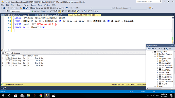 Chào mọi người, mình gặp chút khó khăn khi truy vấn bài tập, đề yêu cầu “Danh sách mã số, họ tên nhữ sinh viên đứng đầu về điểm thi lý thuyết môn Cơ sở dữ liệu”. Mình đã lọc ra những sinh viên có điểm môn CƠ sở dữ liệu và có thể lấy ra một bạn cao nhất nhưng để lấy ra tất cả các bạn cao nhất thì làm cách nào ạ, mình cảm ơn mọi người đã giúp đỡ.
