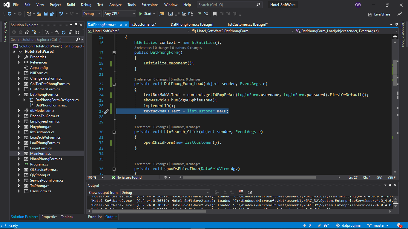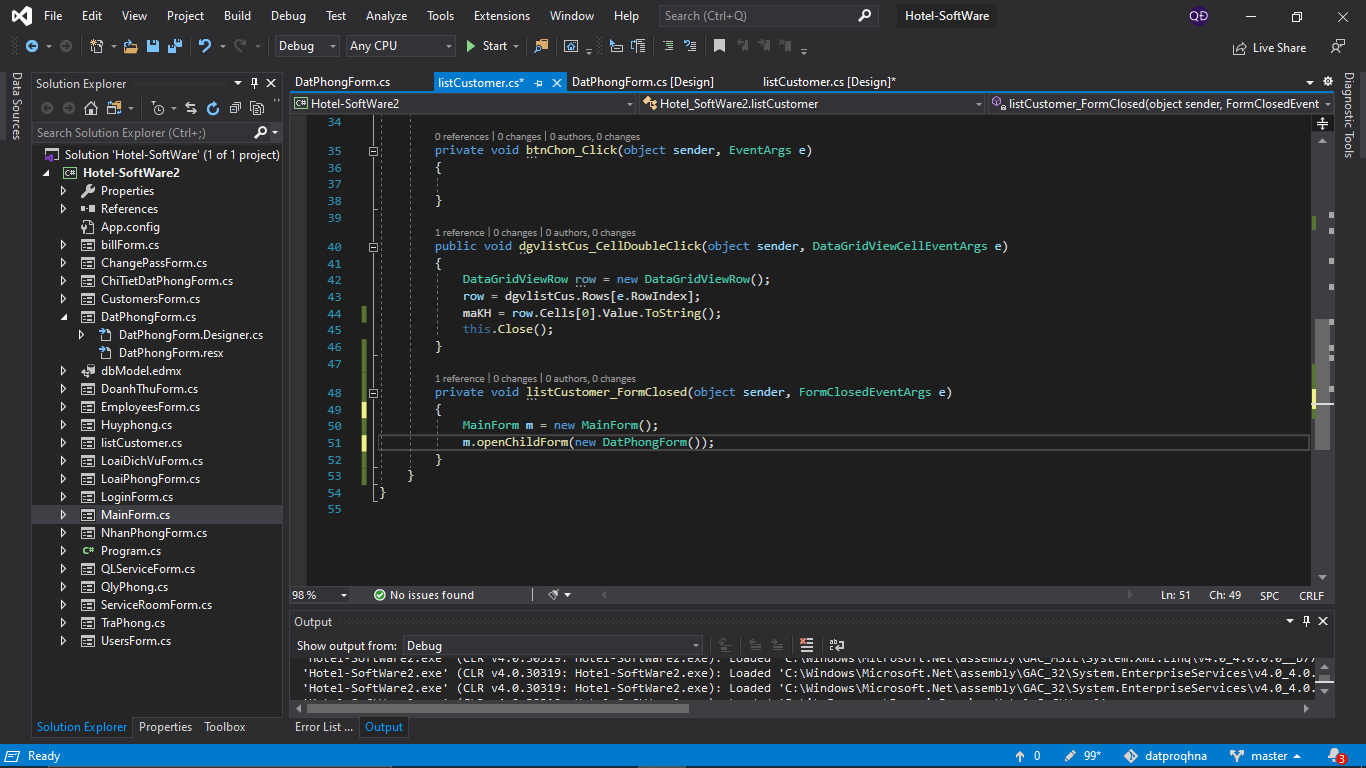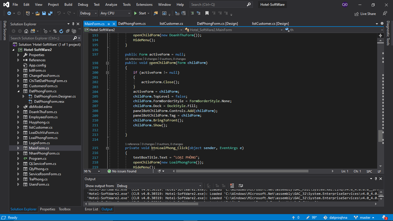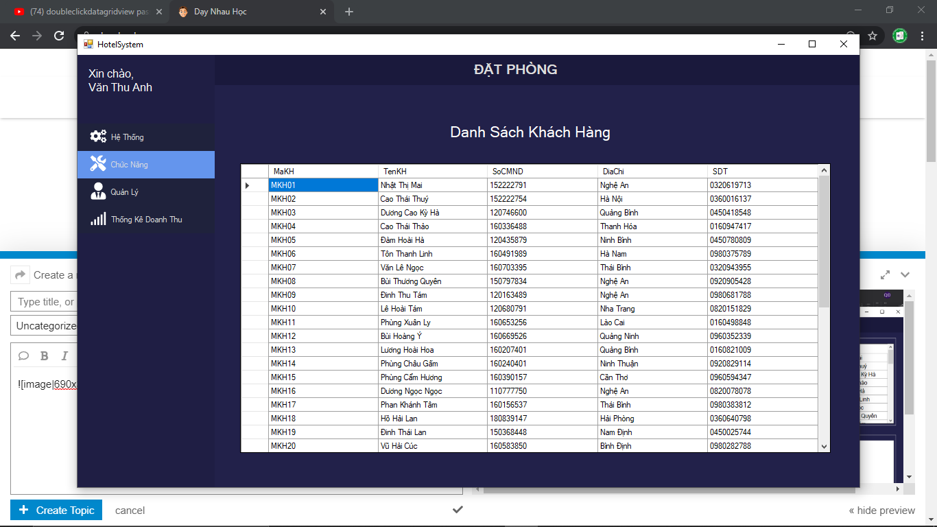 khi mình click vào button tìm kiếm thì sẽ ra 1 danh sách khách hàng, khi mình double click vào 1 dòng trong datagridview thì mình muốn chuyển mã khách hàng qua textbox ở form 1, không biết có cách nào khi form 2 closed thì form 1 sẽ hiển thị dữ liệu luôn không? Nếu không thì chỉ còn cách là load lại form 1. Nhưng ở đây khi ấn vào button “Chức năng” trên menu mình sẽ có riêng 1 hàm openChildForm() riêng chứ k dùng .Show(). Và mình đã thử dùng event FormClosed bên form 2 để load lại form 1 mà không được, mn có thể cho mình hướng giải quyết không ạ?