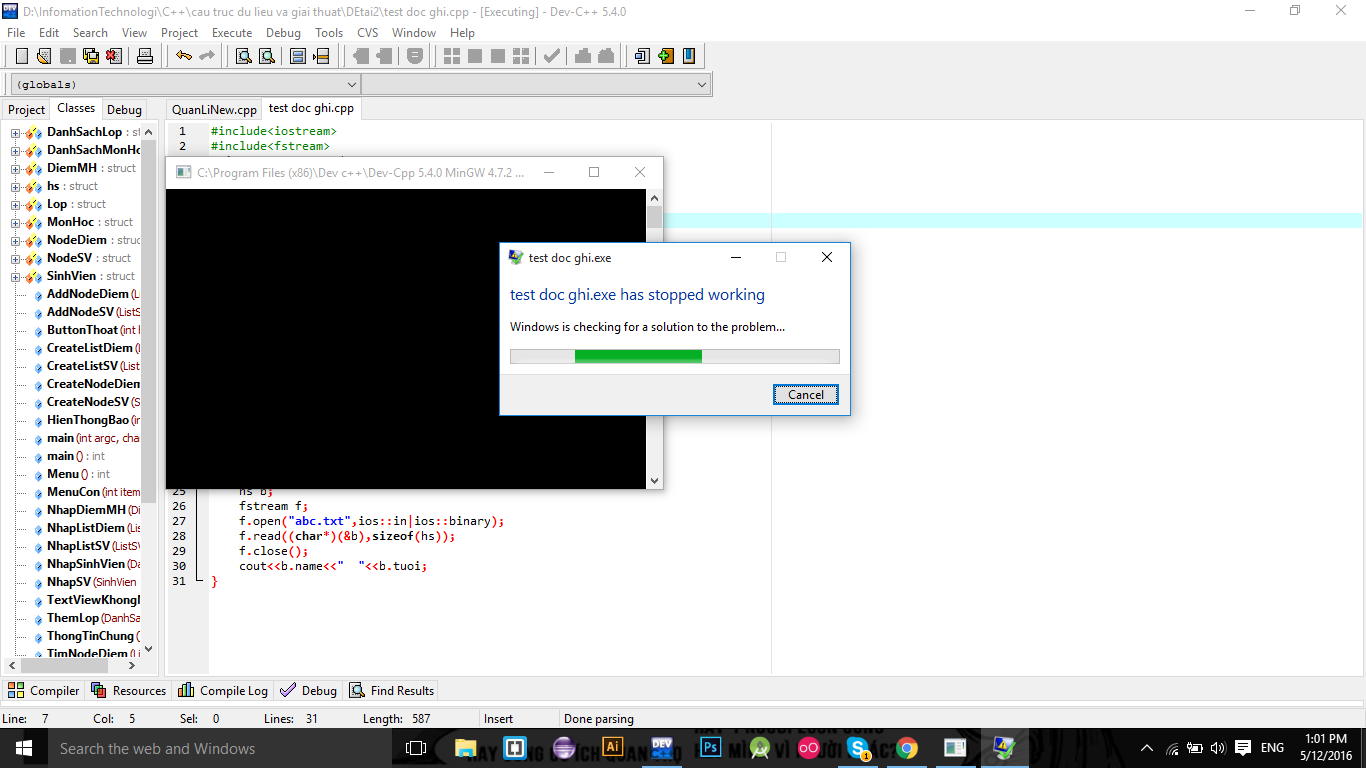 nhưng vấn đề là ở chỗ, nếu em comment lại hàm main đầu tiên và cho chạy hàm main thứ 2 ( tức là em chỉ đọc file ) thì lại có lỗi , em nghĩ là lỗi do hs b chưa có thông tin mà mình lại bắt cout ra nên có lỗi, nhưng vì em đã chạy hàm main đầu tiên trước nên file đã có thông tin, sau đó em đọc file lưu vào hs b vậy tại sao lại không được.