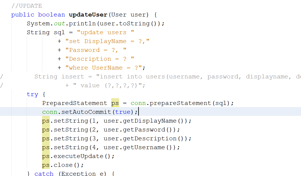 Chào m.n. Mình có đang code phần update bằng PrepareStatement trong java.