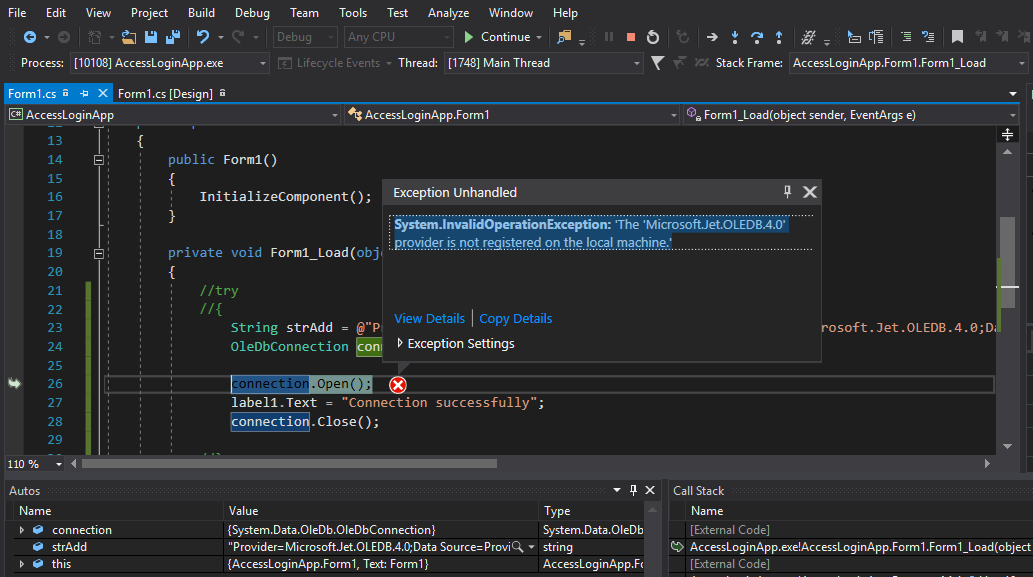 còn tạo project (winform tên file là AccessLoginApp) trên vs 2017 thì lại báo lỗi (nhưng dùng vs 2017 chạy file Logindemo2010 lại không lỗi) , liệu do em chưa cài vs 2017 đầy đủ hay nó không tương thích trên vs 2017