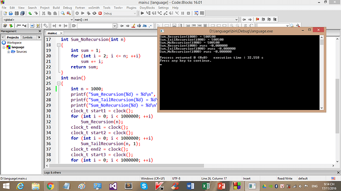 Thì mọi người cũng biết là khử đệ quy chạy nhanh nhất, tiếp đó là đệ quy đuôi rồi mới tới đệ quy, nhưng trong CodeBlocks thì thời gian chạy luôn là … 0 !