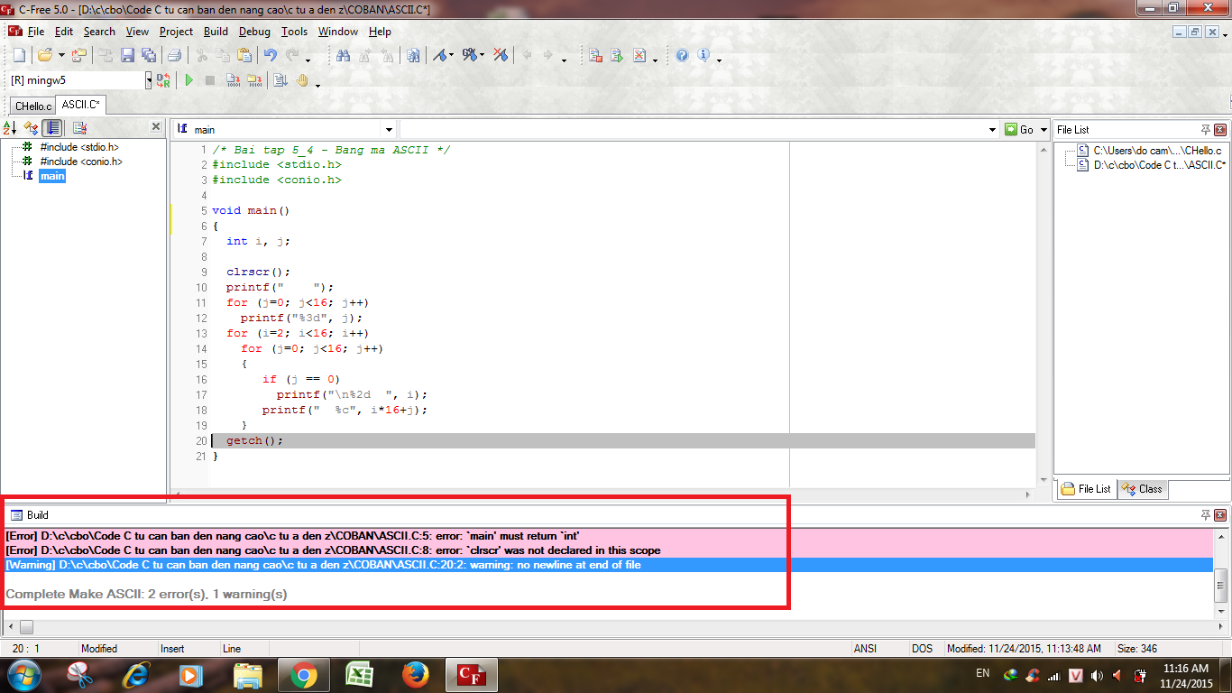 - void main bạn sửa thành int main rồi cuối chương trình return 0;