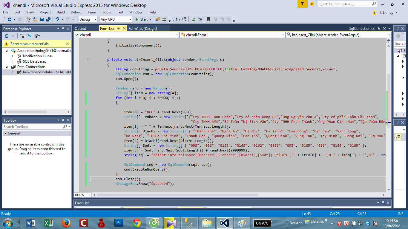 em có viết một đoạn code để chèn nhiều dữ liệu vào bảng trong database nhưng khi chạy nó không thực hiện được nhưng chưa tìm ra cách khắc phục nên nhờ sự giúp đỡ của mọi người được không ạ.